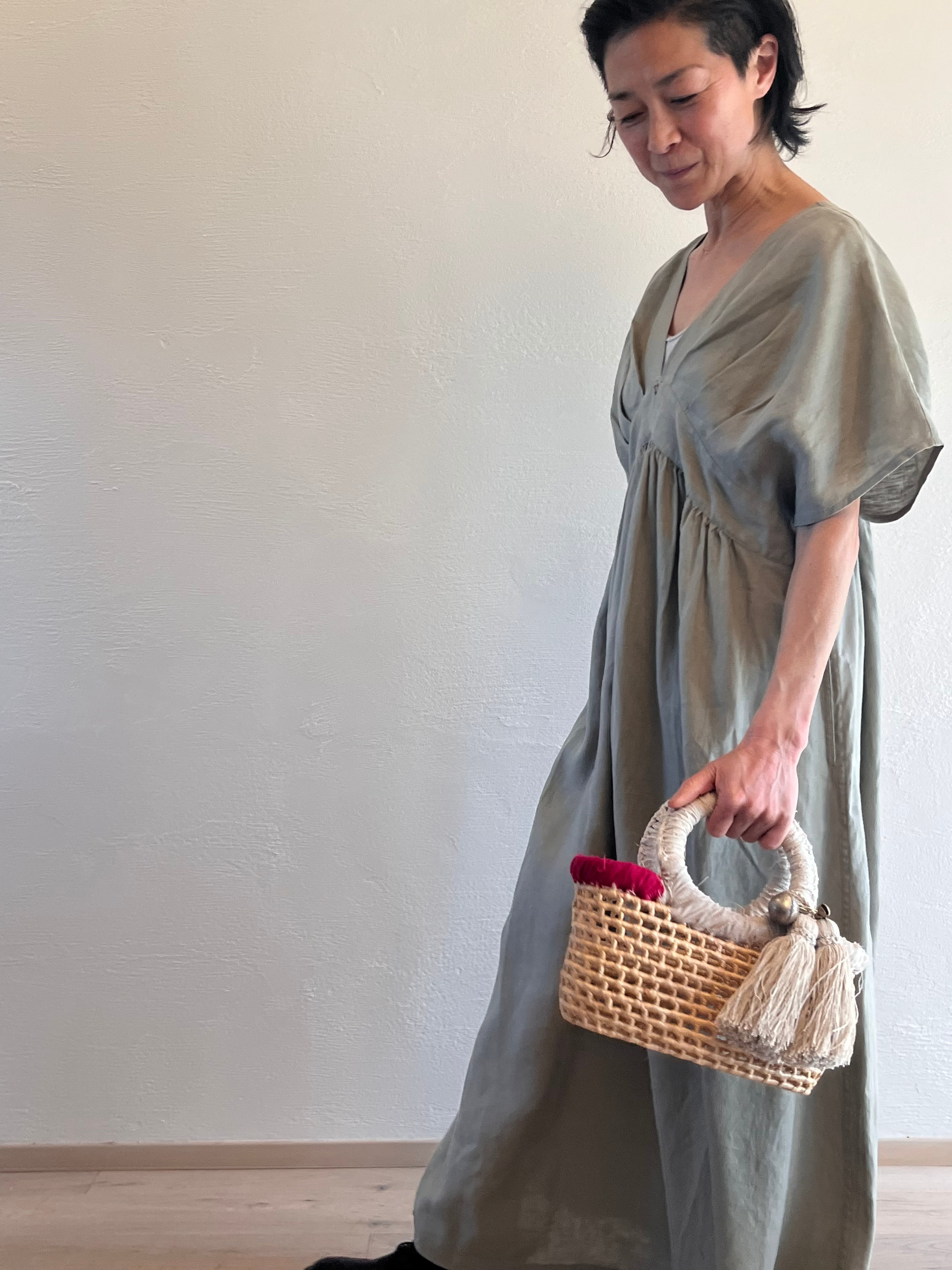 リネンタックVネックワンピース グレージュ