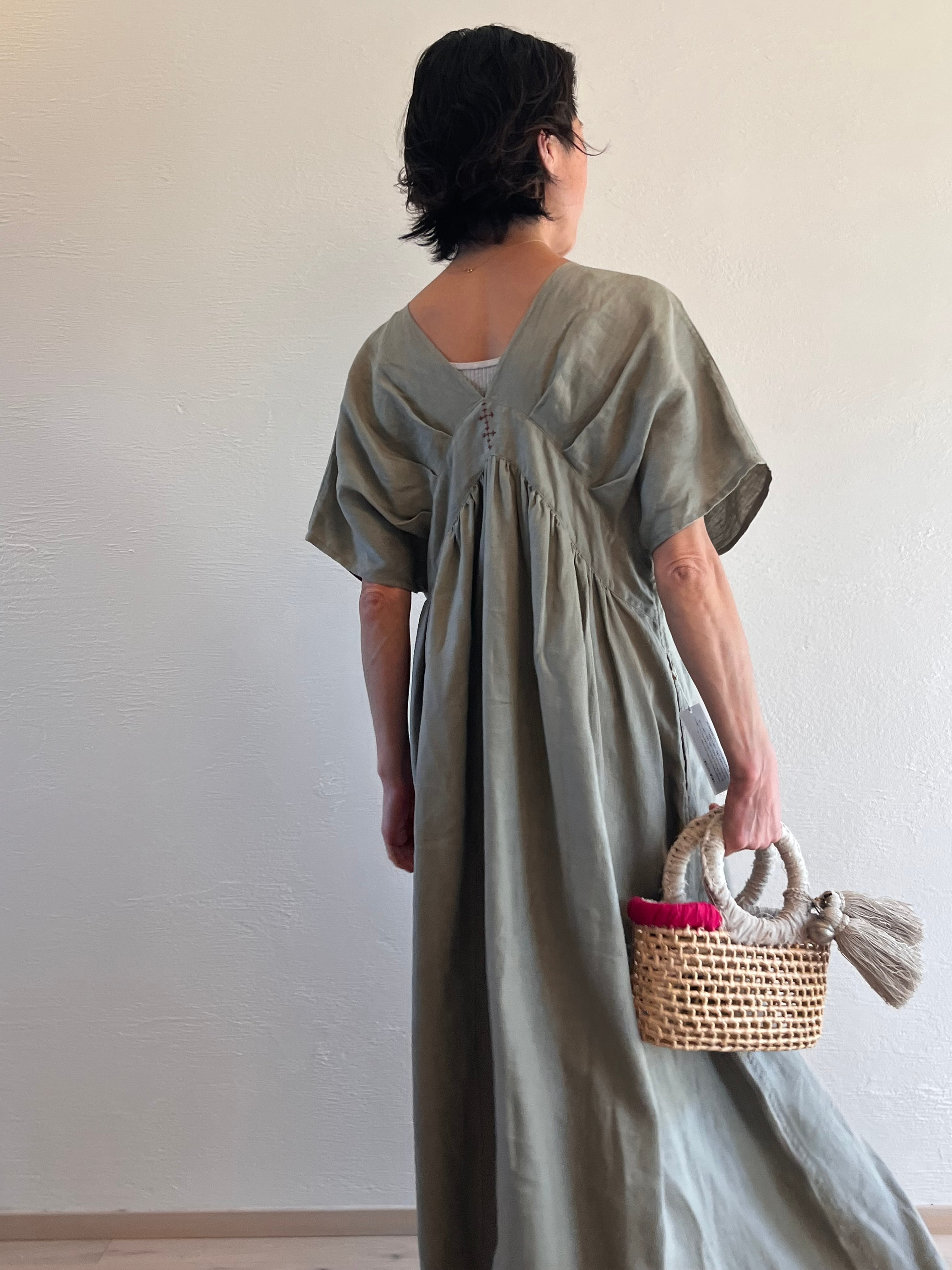 タックが施されたVネックドレスは、リネン素材の柔らかな着心地と美しいシルエットが魅力です。前後にはモン族刺繍が施されており、楽しめるデザインとなっています。二の腕をすっぽりとカバーし、安心して着用できるため、日常のお出かけから特別なシーンまで幅広く活躍します。