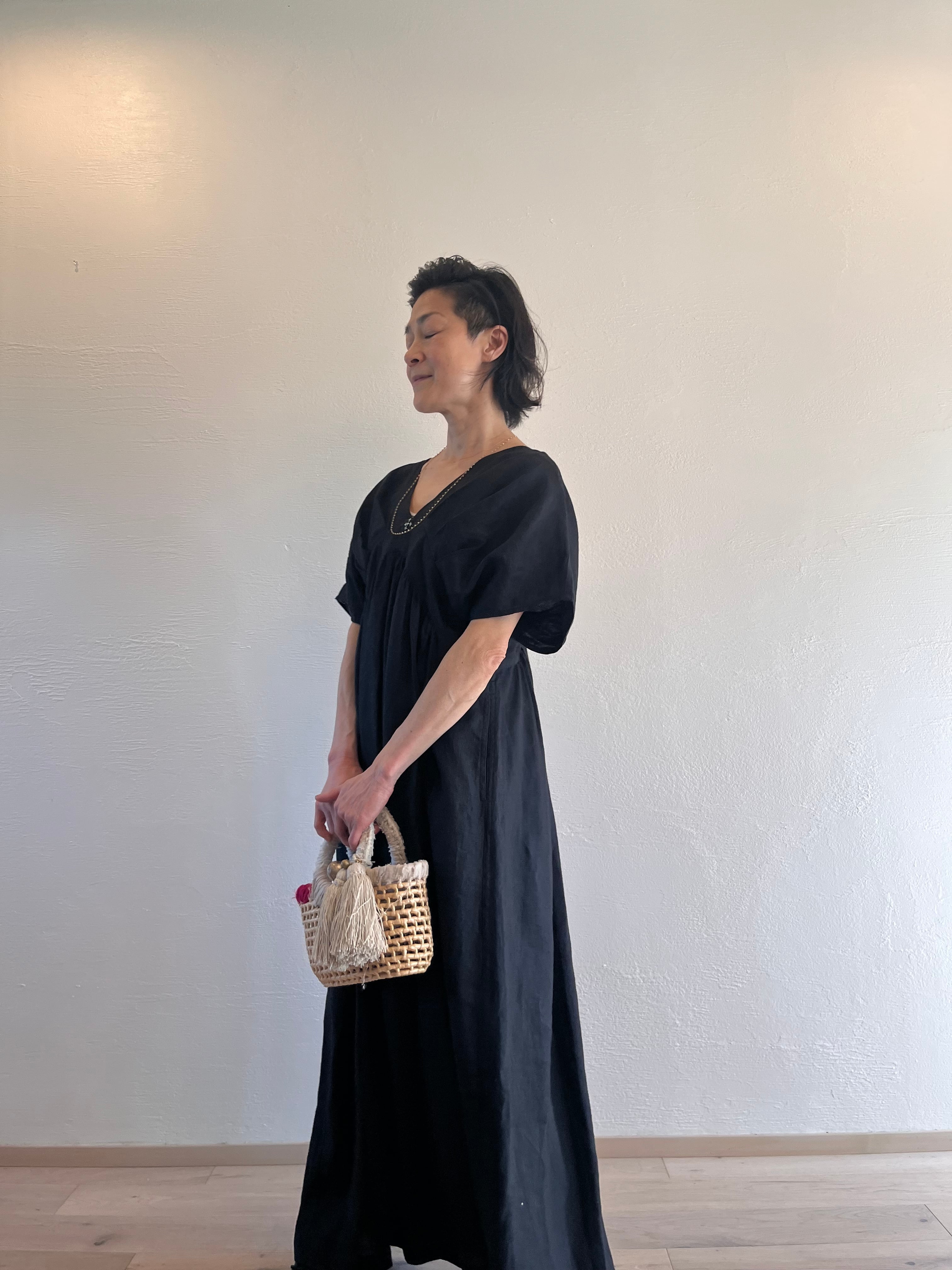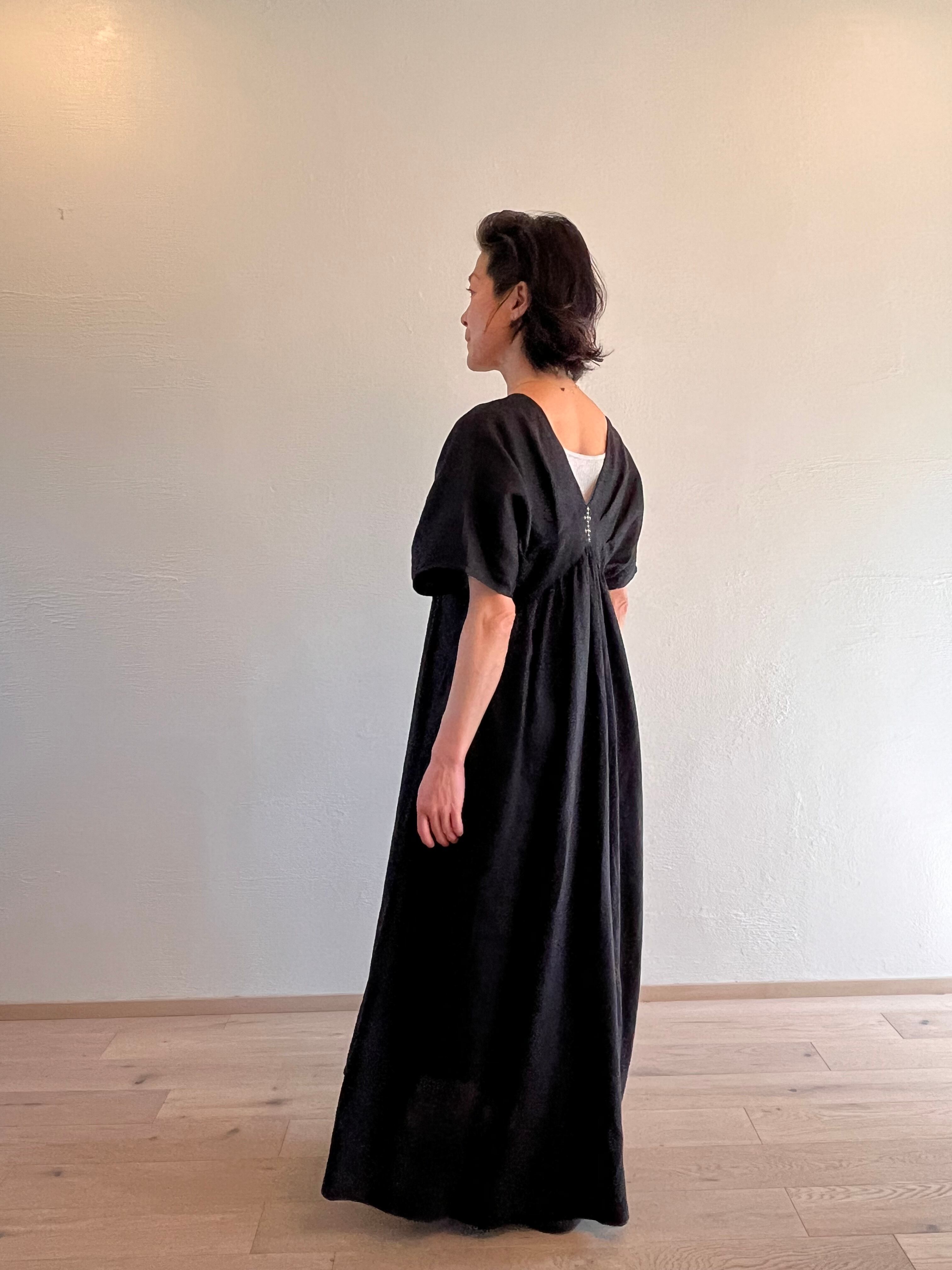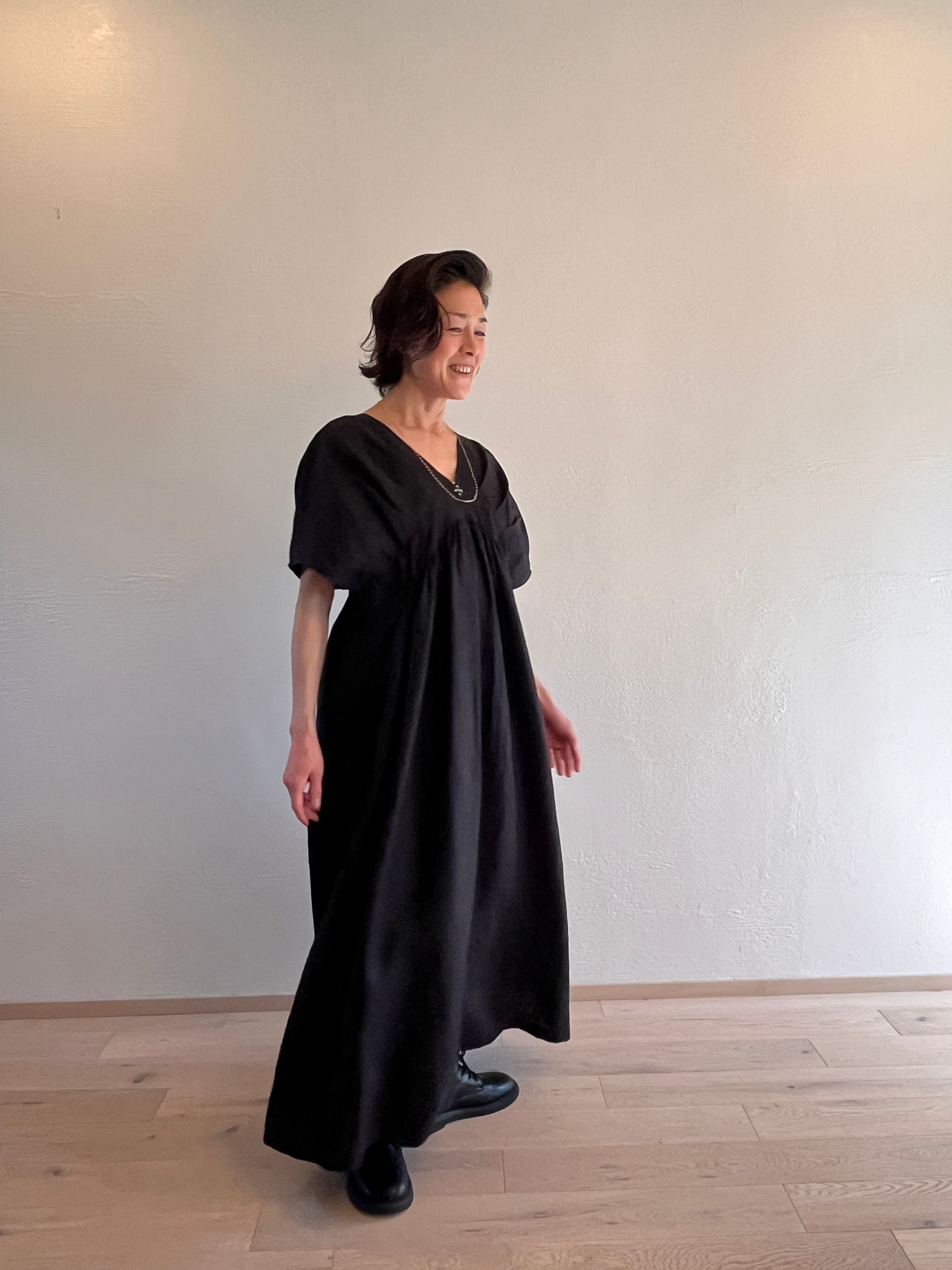 タックVネックワンピース マキシ丈 black
