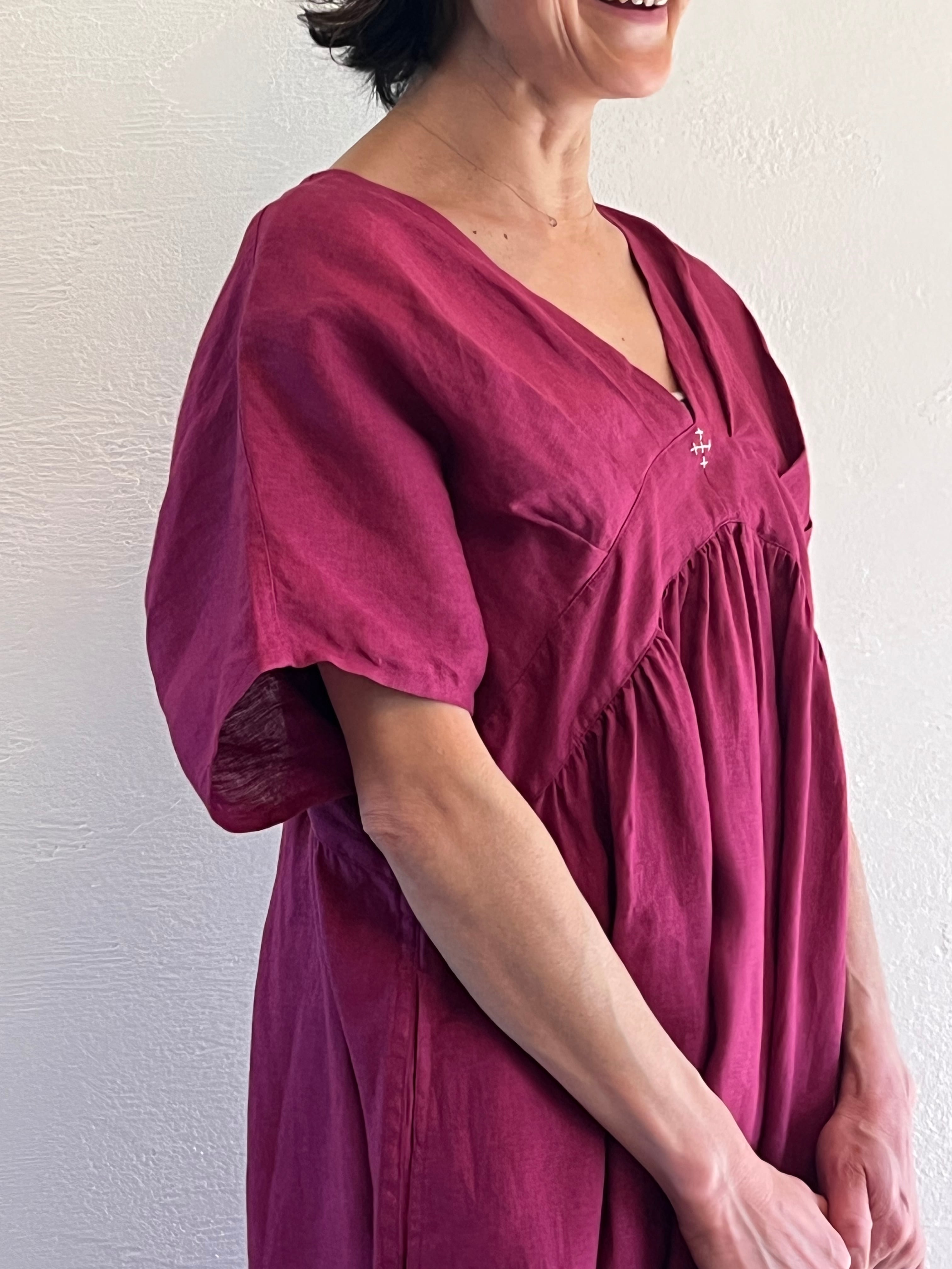 タックV ネックドレス パープルレッド