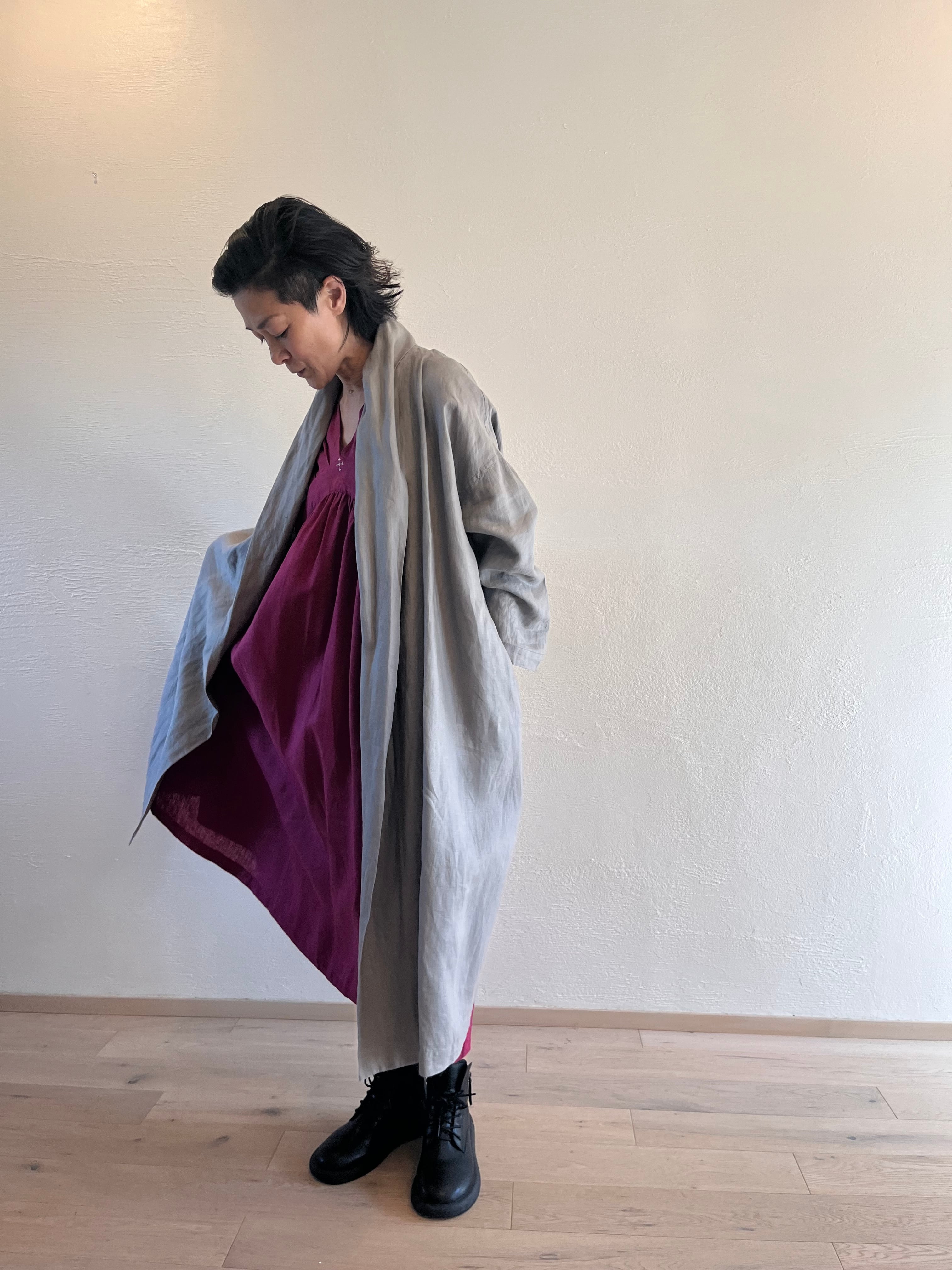 タックが施されたVネックドレスは、リネン素材の柔らかな着心地と美しいシルエットが魅力です。前後にはモン族刺繍が施されており、楽しめるデザインとなっています。二の腕をすっぽりとカバーし、安心して着用できるため、日常のお出かけから特別なシーンまで幅広く活躍します。